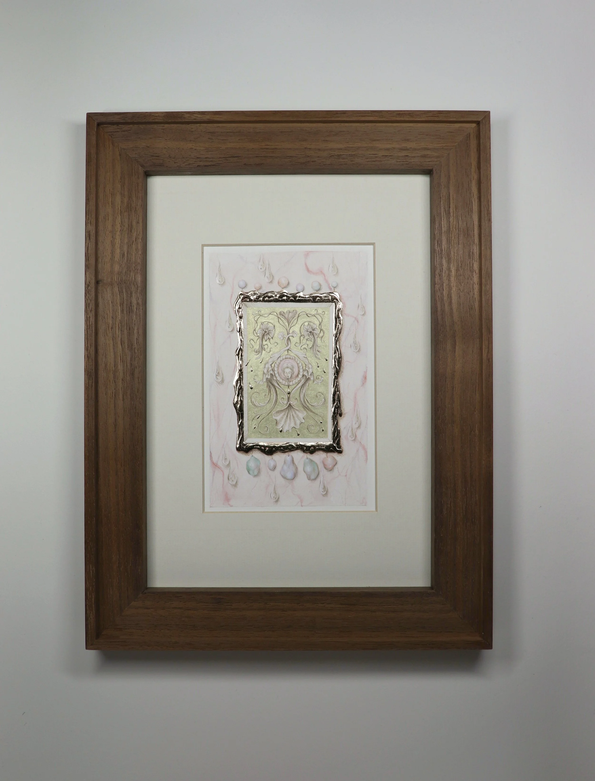 Handmade shell gold on paper with walnut ink and carbon black ink. + Walnut frame.